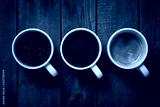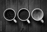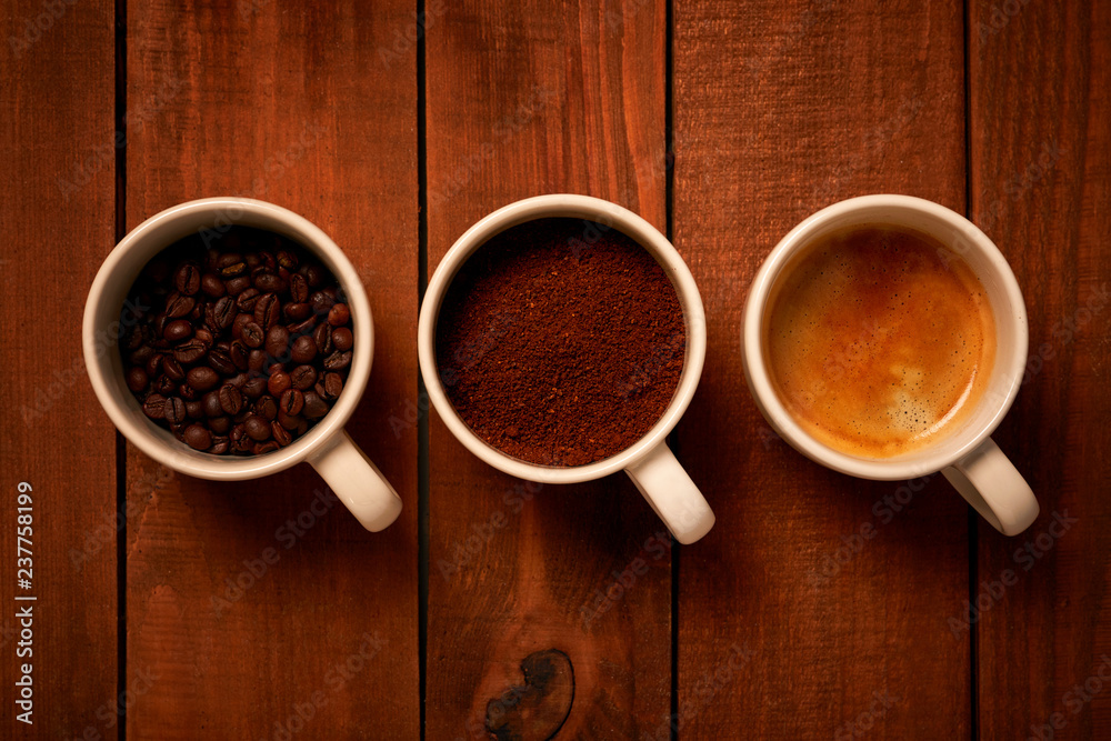 Three cups of espresso, freshly ground coffee and coffee beans on a wooden table from the top view