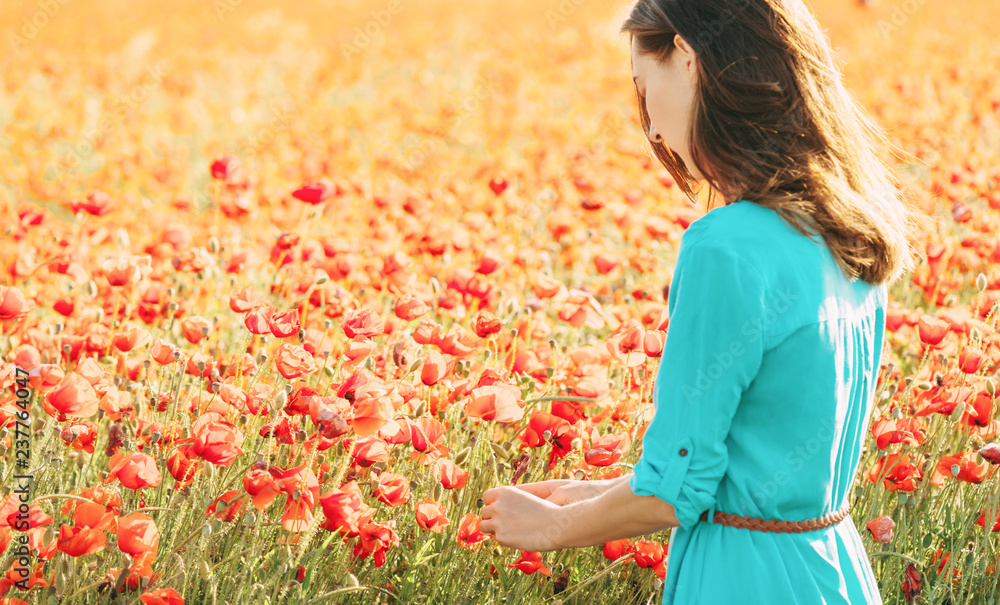 Young woman picking poppies in meadow.