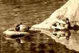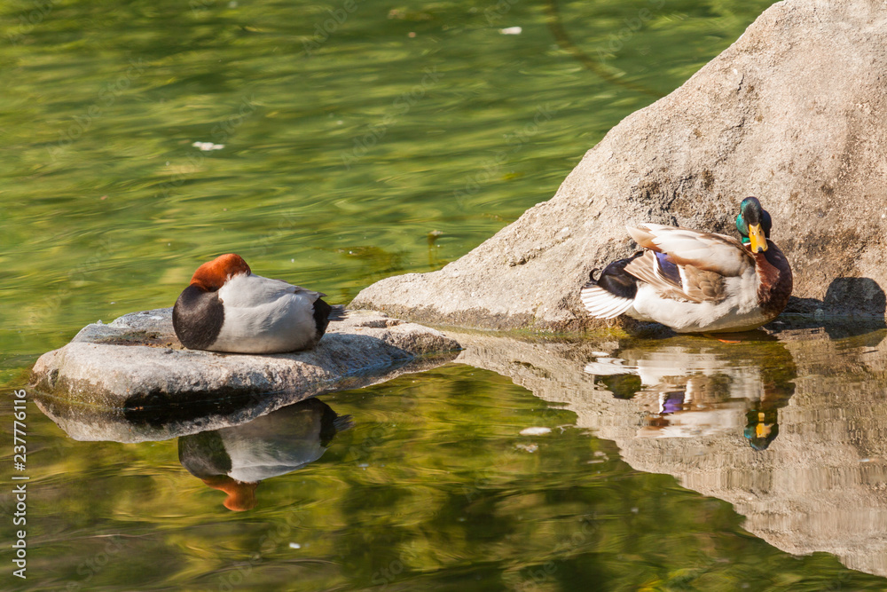 Mandarin duck swimming with another ducks on a pond.