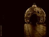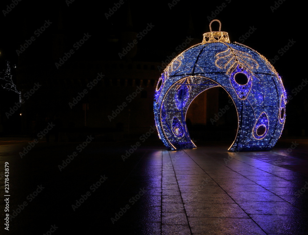 Decorative beautiful big Chreestmas tree bauble ad decorations stands on square in city center, at night, nice reflections on wet ground