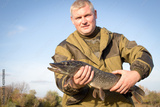 Happy fisherman with large pike fish a trophy. Fisherman shows a fish.
