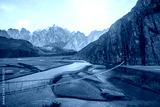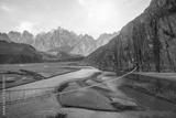 Landscape view of Hussaini hanging bridge above Hunza river, surrounded by mountains. Gojal, Gilgit Baltistan, Pakistan.