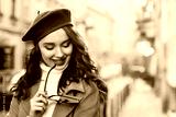 Outdoor close up portrait of young beautiful happy smiling woman with long hair wearing trendy autumn clothes, green beret, model walking in street of european city. Copy, empty space for text