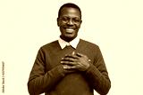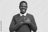 Handsome cheerful black man keeps both hands on chest, feels touched or thankful, smiles broadly, wears elegant green sweater, models over white background. People, gratitude and feeling concept