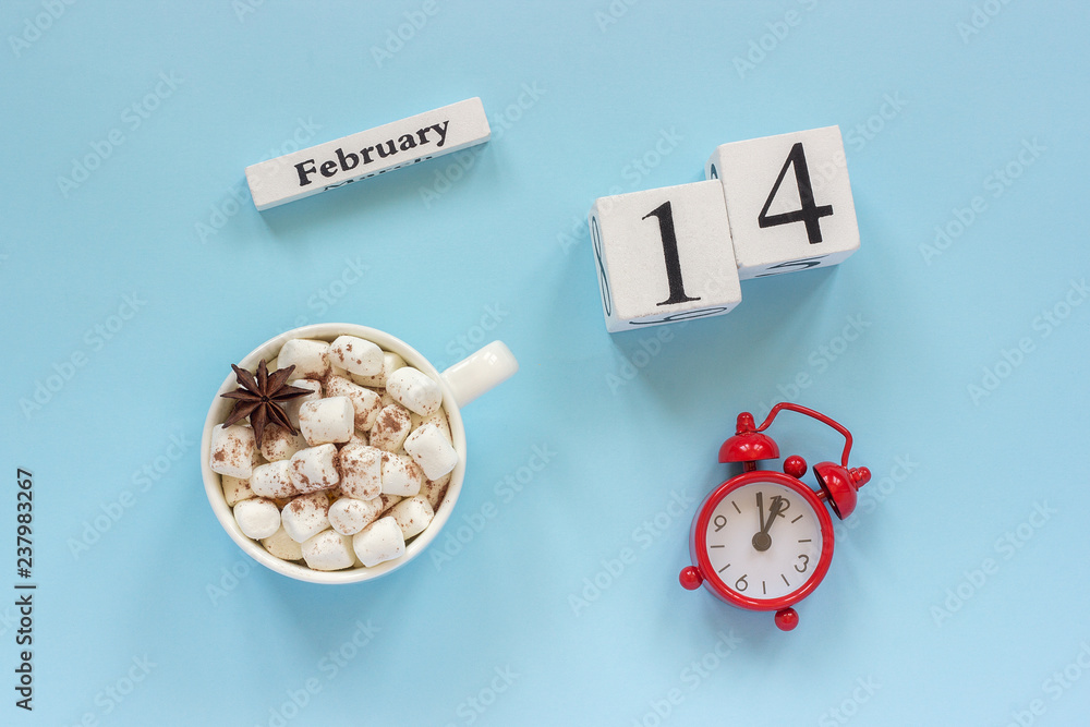 Winter composition. White wooden calendar cubes. Data February 14th. Cup of cocoa with marshmallow and red alarm clock on blue background Top view Flat lay. Concept good morning to valentines day