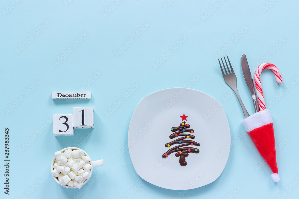 Calendar December 31st. Sweet chocolate Christmas tree on plate, cutlery in santa hat and cup of cocoa with marshmallow on blue background. Flat lay Top view Concept New Year's treat at festive table