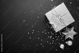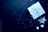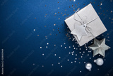 Merry Christmas and Happy Holidays greeting card, frame, banner. New Year. Noel. Silver Christmas gifts, ornaments on blue background top view. Winter holiday xmas theme. Flat lay.