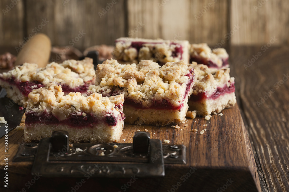 Raspberry bars on rustic wooden table