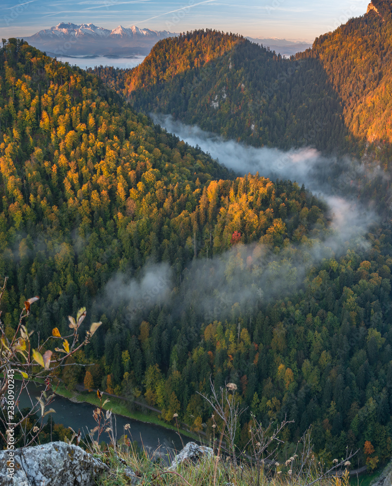 Beautiful morning panorama of Dunajec river gorge and Tatra mountains, colorful autumn