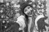 Happy smiling woman held out her hands. Model wearing knitted blue hat, red gloves, white sweater. Christmas, winter holidays, new year concept