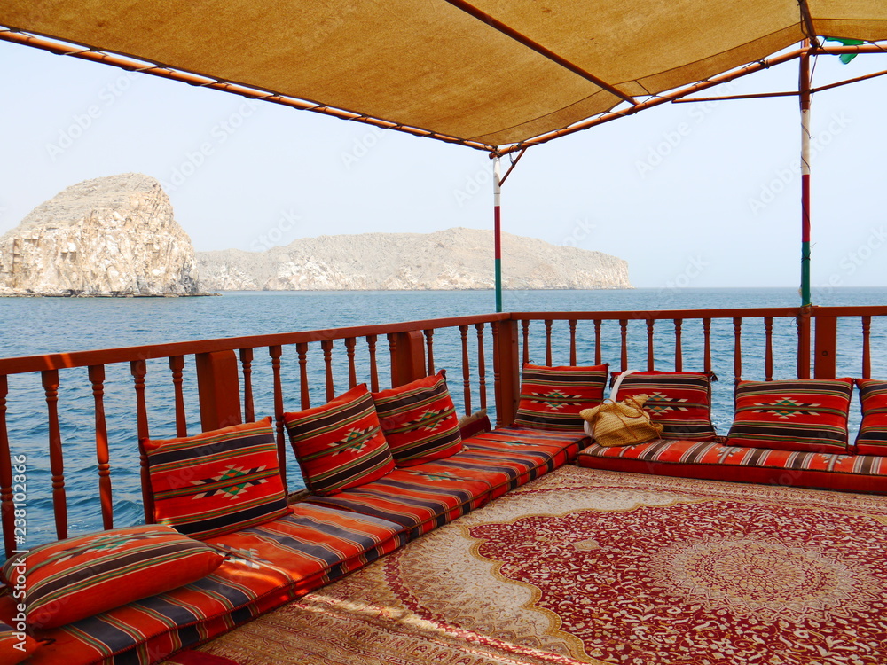 view onside a traditional dhow boat with pillows and carpet cruising the magnificant fjords of Khasab, Musandam, Oman, Middle East