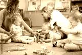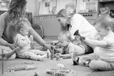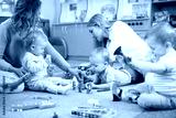 Friends with children toddlers playing on the floor in montessori centre