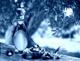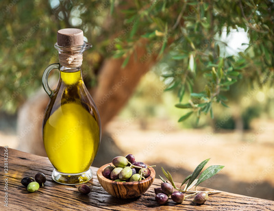Bottle of olive oil and berries are on the wooden table under the olive tree.