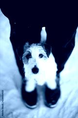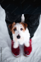 Beautiful puppy of breed Jack Russell Terrier in the winter forest