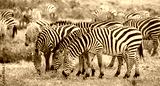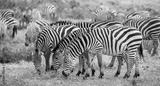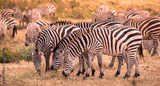 Herd of zebras in african savannah. Zebra with pattern of black and white stripes. Wildlife scene from nature in Africa. Safari in National Park Ngorongoro Crater, Tanzania.
