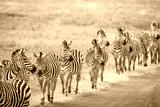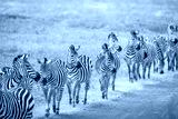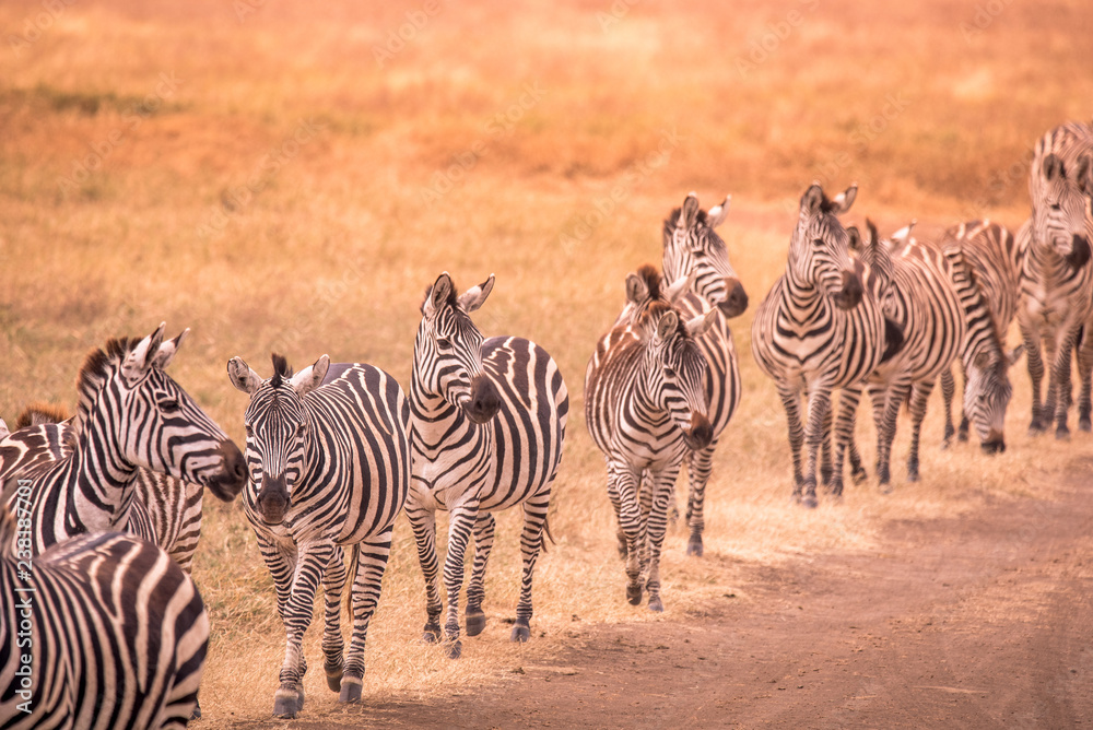 Herd of zebras in african savannah. Zebra with pattern of black and white stripes. Wildlife scene from nature in Africa. Safari in National Park Ngorongoro Crater, Tanzania.