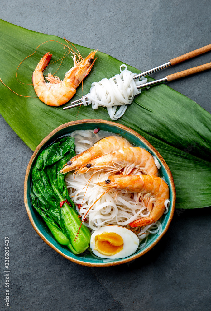 Rice noodles with Shrimps, Egg, Pok choy cabbage in blue bowl, gray background. Top view