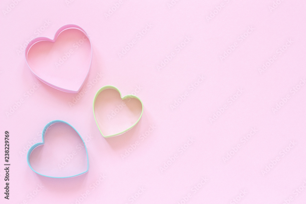 3 colored cutters cookies in heart shape on pastel pink background. Concept Valentine's card. Top view Copy space for text.