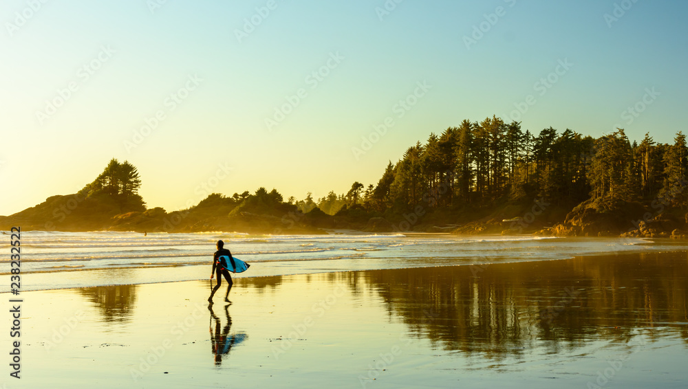 Ein Surfer geht an einem Strand auf Vancouver Island entlang