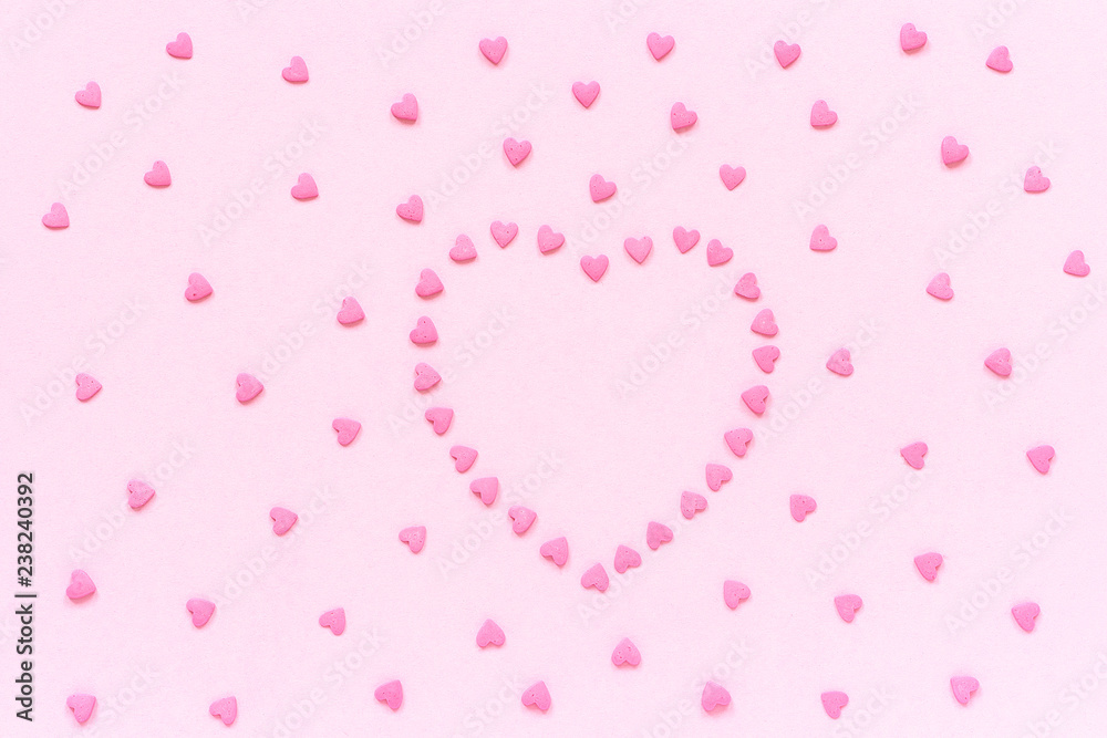 Pink confectionery sprinkles in heart shape on pastel pink background. Concept Valentine's card. Top view Copy space for text