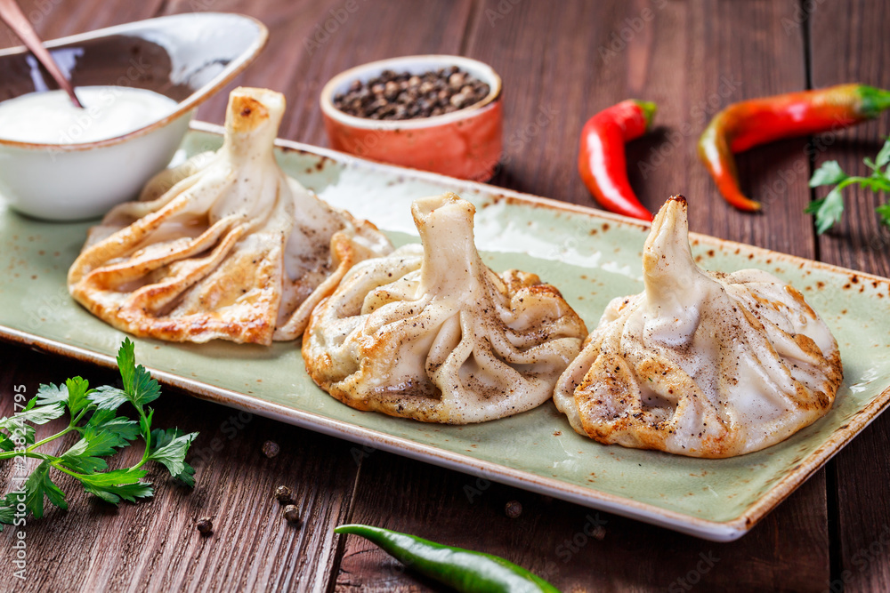Traditional russian pelmeni, ravioli, dumplings with meat in plate on wooden background. Parsley, sour cream and spices. Healthy food