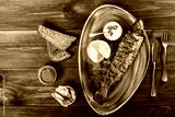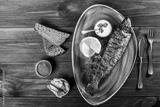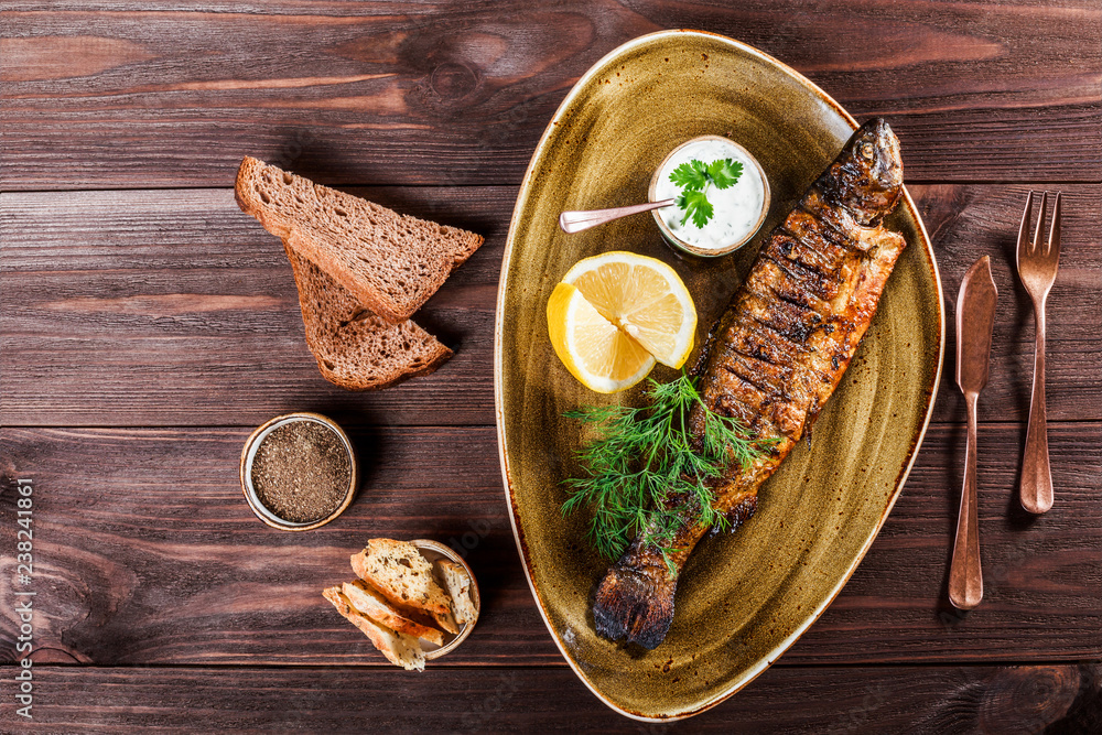 Baked fish with lemon and greens on plate on wooden background. Delicious dish of seafood. Top view