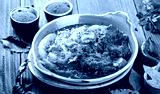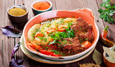 Baked meat with grilled vegetables, potatoes, greens in plate on wooden background. Hot Meat Dishes