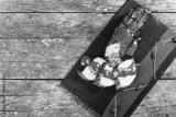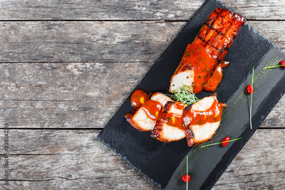 Grilled smoked ham with tomato sauce on stone slate background on wooden background. Hot Meat Dishes. Top view