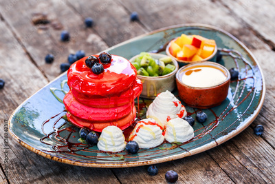 Pink pancakes with honey, chocolate, jam, whipped cream, berries and fruits on plate. Traditional Russian cuisine at the Pancake week or Shrovetide. Healthy breakfast