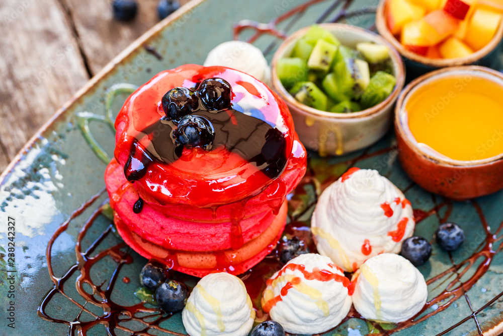 Pink pancakes with honey, chocolate, jam, whipped cream, berries and fruits on plate. Traditional Russian cuisine at the Pancake week or Shrovetide. Healthy breakfast. Flat lay. Top view
