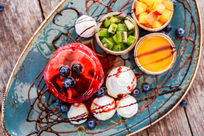 Pink pancakes with honey, chocolate, jam, whipped cream, berries and fruits on plate. Traditional Russian cuisine at the Pancake week or Shrovetide. Healthy breakfast. Flat lay. Top view