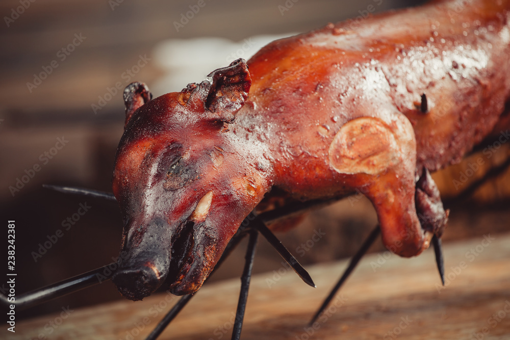 Whole grilled pig with meat steak on cutting board. Hot Meat