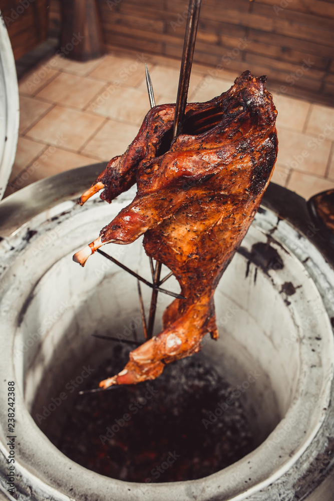 Grilled lamb on fire and coal, hot tandoor grill. Hot Meat dishes