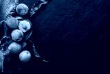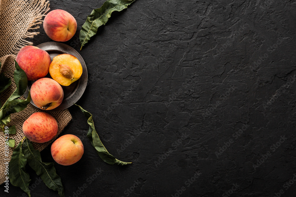 Ripe peaches on black stone background. Healthy food concept, top view, copy space