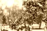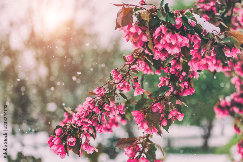 Blossom tree over nature background. Beautiful nature scene with blooming tree, sun and snow. Easter Sunny day. Spring flowers. Springtime. Selective focus