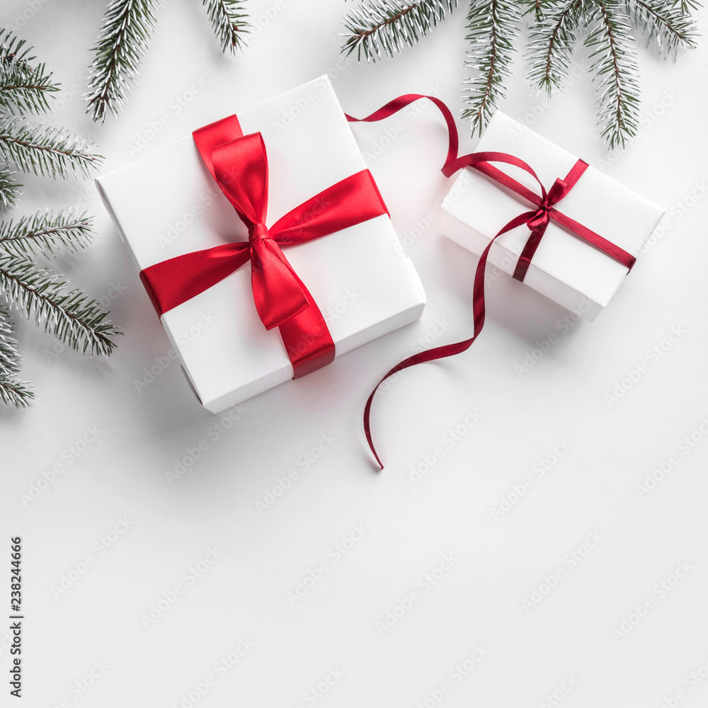 Creative frame made of Christmas fir branches on white paper background with red decoration, pine cones, gift boxes. Xmas and New Year theme. Flat lay, top view