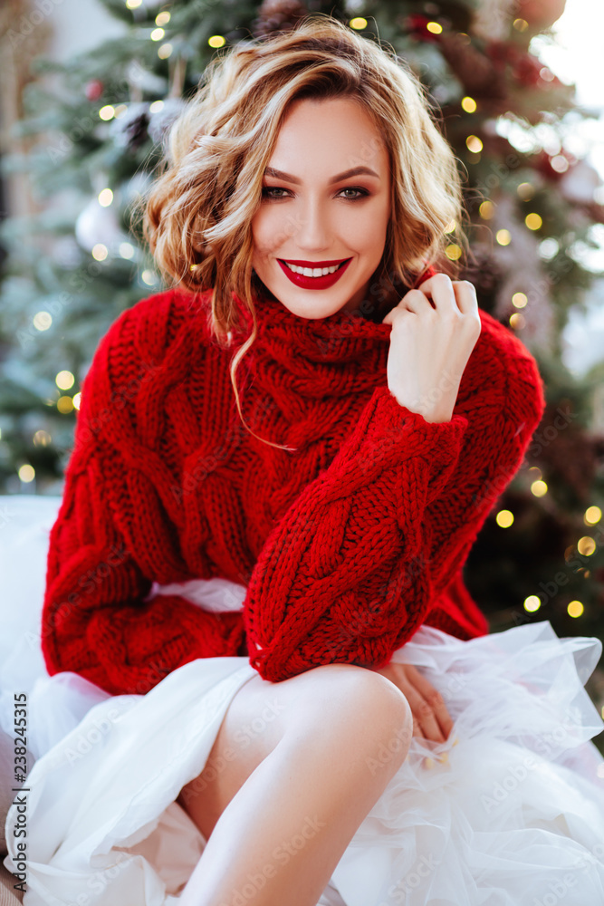 holidays, celebration and people concept - smiling woman in red sweater over christmas tree background