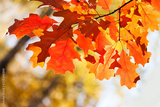 Beautiful Red oak leaves background. Autumn foliage colorful orange brown leaves, sunny day forest scene. Selective focus.