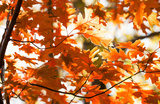 Beautiful Red oak leaves background. Autumn foliage colorful orange brown leaves, sunny day forest scene. Selective focus.