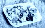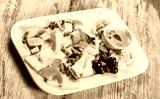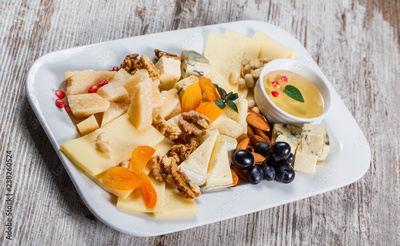 Cheese platter garnished with pear, honey, walnuts in plate over rustic background. Snacks and Wine appetizers set