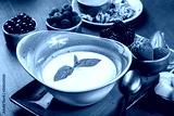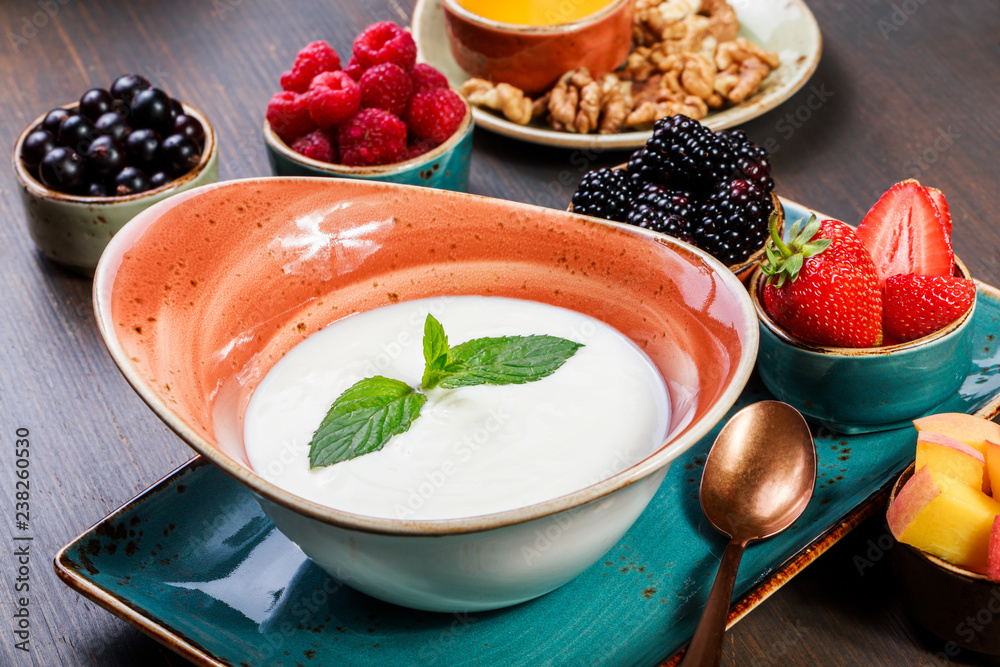 Yogurt with topping of currants, strawberries, peaches, raspberries, nuts and honey on dark wooden background. Fresh yogurt. Healthy breakfast. Top view