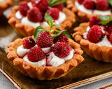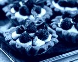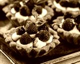 Fruit tart with raspberries and cream, cakes and sweetness on holiday background. Delicious dessert and candy bar.