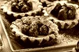 Fruit tart with raspberries and cream, cakes and sweetness on holiday background. Delicious dessert and candy bar.