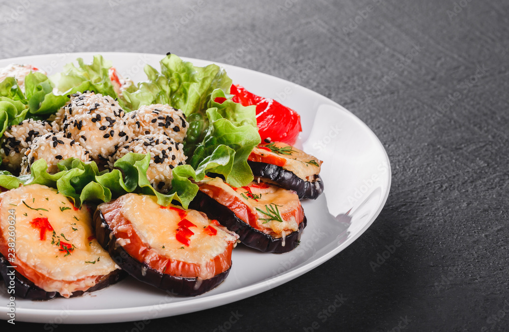 Healthy appetizer, grilled zucchini and eggplant with cheese with cheese on plate over black stone background. Clean eating, vegan food concept