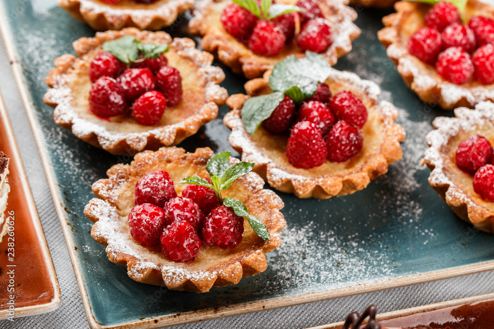 Fruit tart with raspberries and cream, cakes and sweetness on holiday background. Delicious dessert and candy bar.