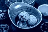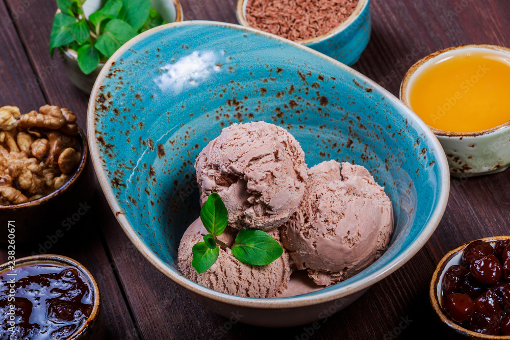 Chocolate ice cream scoops in bowl with mint leaves on wooden background