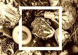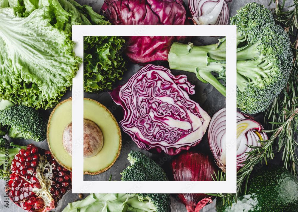 Healthy raw summer vegetables, fresh salad, avocado, greens, spinach, pomegranate, cabbage, broccoli and frame of paper. Healthy vegan food, clean eating, top view, flat lay