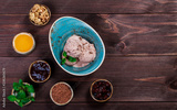 Chocolate ice cream scoops in bowl with mint leaves on wooden background. Top view