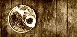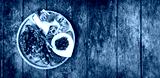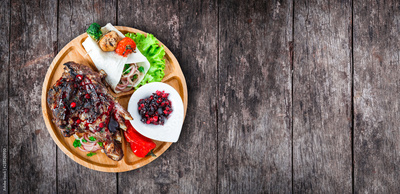 Grilled Ribeye Steak on bone with berry sauce, fresh salad and grilled vegetables on cutting board on wooden background close up. Hot Meat Dishes. Top view