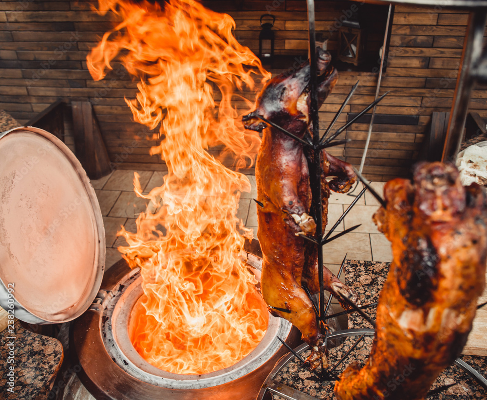 Grilled pig, roasted rabbit, lamb traditional, hot tandoor grill. Hot Meat dishes